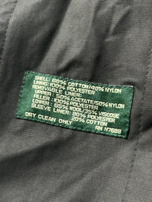 Material: 60% COTTON 40¡ó NYLON / LINING 100% POLYESTER / LINER : UPPER 50% ACETAT 50% NYLON FILLER 100% POLYESTER LOWER 65¡ó WOOL 35% VISCOSE / SLEEVE LINER : 80% POLYESTER 20% COTTON